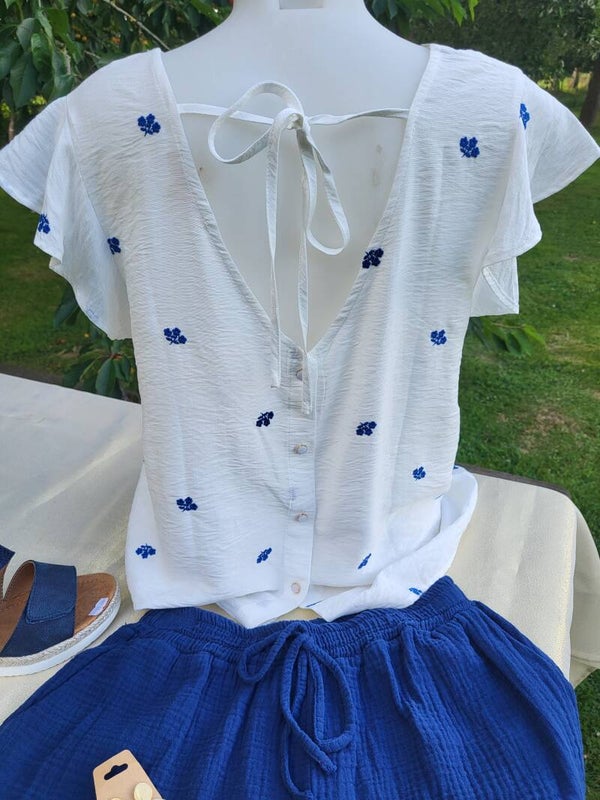 Top blanc avec petits motifs bleu.